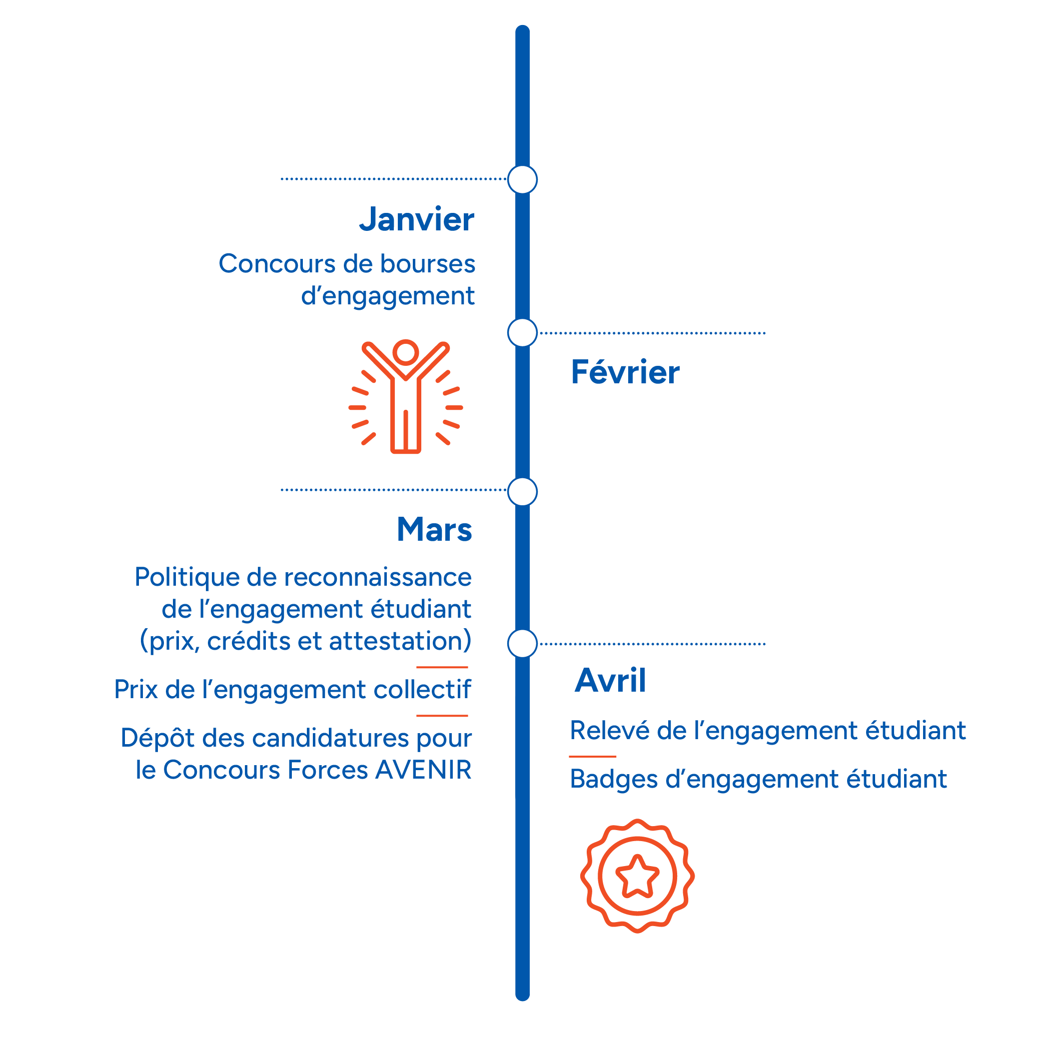 D’autres dispositifs reconnaissent l’engagement étudiant, que ce soit des entités de l’Université, tels que les Services à la vie étudiante et la FAECUM, ou des organismes externes comme Forces AVENIR. Cette reconnaissance peut prendre la forme de crédits, d’attestations, de bourses, de prix, de subventions et de célébrations.